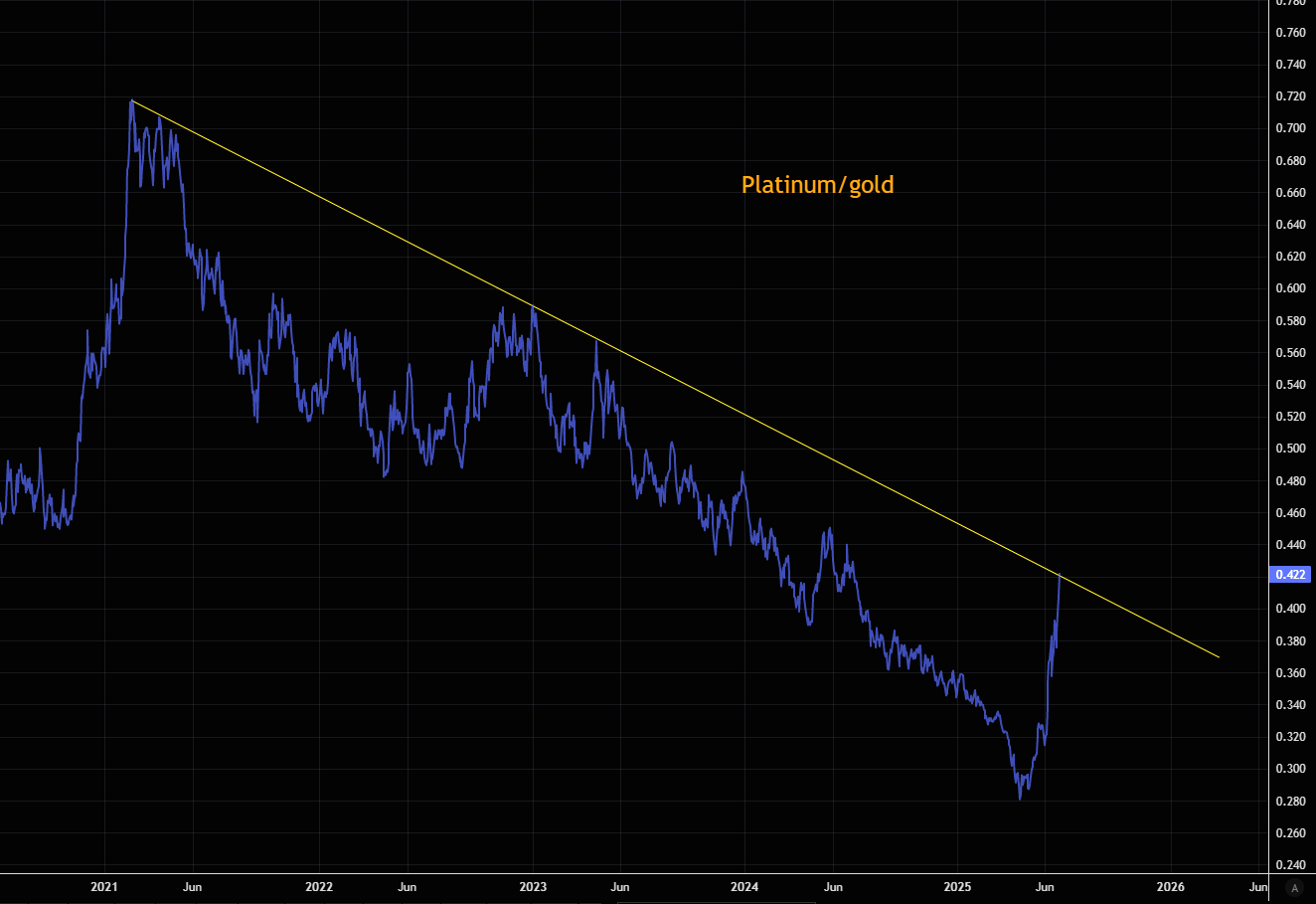 Platinum/gold ratio has exploded to the upside, actually reaching the longer term negative trend line as of writing...