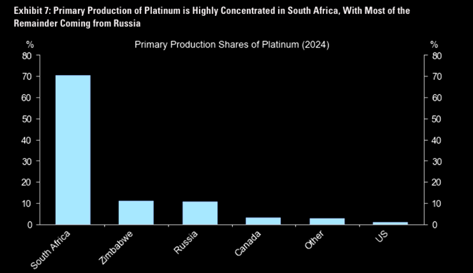 Platinum production is highly geographically concentrated, with South Africa accounting for 70% of primary platinum production.