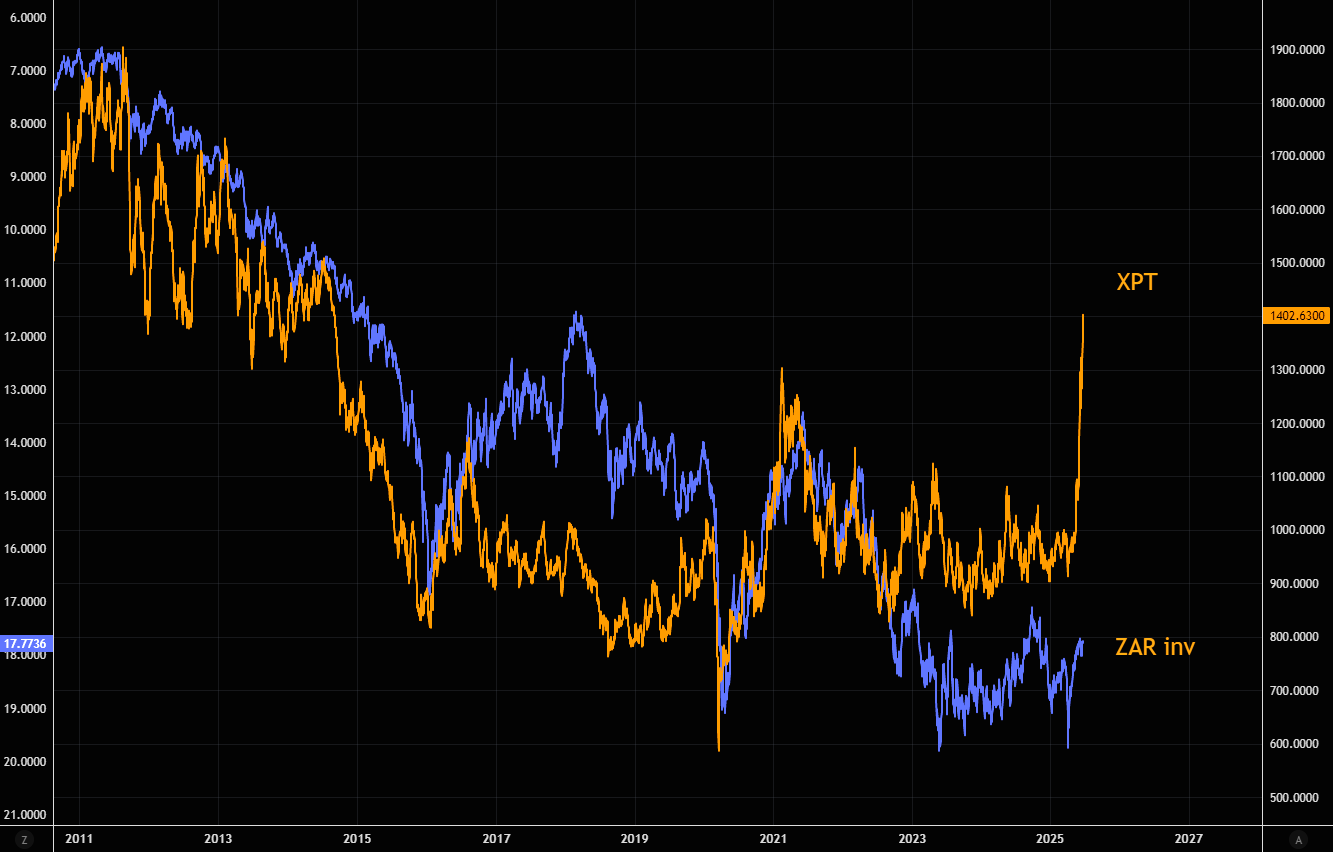 Platinum vs ZAR inv has moved in close tandem for many years. ZAR as a platinum laggard play?