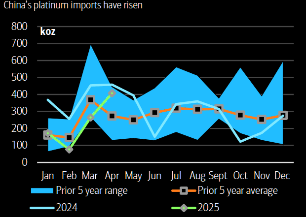 "...shows a pick-up of platinum imports by China. Given the size of the gold vs the platinum market, even a very small crossover could have a significant impact on platinum balances. For instance, a 1% switch of gold jewellery to platinum could add 700 koz of demand. This would almost double the deficit to 1.6Moz". (BofA)