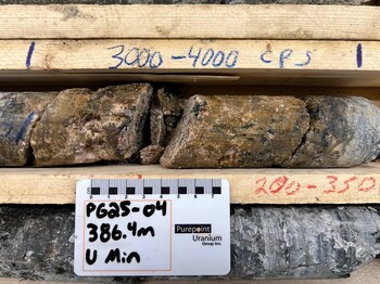 - Drillholes PG25-04 and PG25-05 intersected a steeply dipping, north-south trending mineralized structure at vertical depths of 60 and 20 metres below the unconformity, respectively.