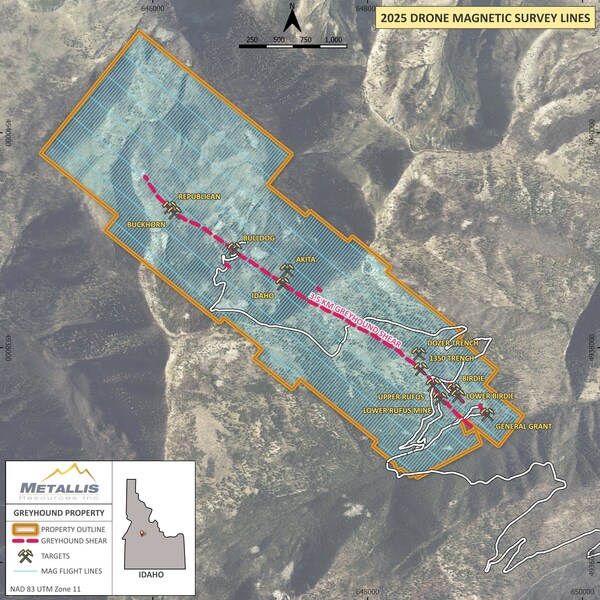 VANCOUVER, BC, July 8, 2025 /CNW/ - Metallis Resources Inc. (TSX-V: MTS) (OTCQB: MTLFF) (the "Company" or "Metallis") is pleased to announce the commencement of the company's 2025 exploration program with the first ever geophysical survey at its Greyhound Property (the "Property") in central Idaho. The high-resolution drone magnetic survey (the "Survey") will identify and refine targets in advance of the Company's planned summer 2025 drill program. A total of 298 line-kilometres will be flown over the entire property with the resulting data expected to further delineate structural controls associated with known mineralization. The Property hosts multiple high-grade silver-gold-antimony prospects within the historic Stibnite Mining District, a prolific region in Idaho known for antimony production. Mineralization at Greyhound is associated with a 3.5 km-long shear zone featuring multiple historic adits and which remains untested by modern drilling or geophysics.