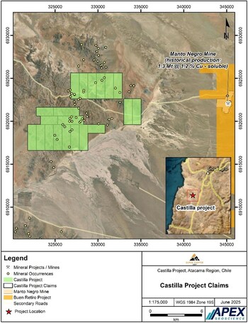 The Castilla Project is a 5,800-hectare package of twenty exploration concessions located in Chile's Atacama Region. The Project lies within the north/northeast Atacama fault system trend, along with the nearby and parallel historic Manto Negro open pit copper mine ("Manto Negro") trend. Government records indicate that there are several mineral occurrences within the Project boundaries. Castilla lies on the same northeast and northwest-southeast structural corridor as the historic Manto Negro, which produced approximately 1.3 million tonnes (Mt) of 1.2% soluble copper between 2005 and 2009 (Source Jobin-Bevans, 2024)*. Manto Negro is an example of near surface oxide copper mineralization that is nearby and may or may not be indicative of mineralization on the Castilla Project. There are a number of historical artisanal workings on the Project lands and occurrences (Figure 1) but the Company has yet to conduct sampling.