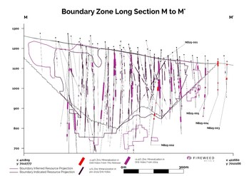 Long section M to M': showing Boundary Zone 2024 resource projected to the section, 2025, 2024 and pre-2024 drilling (CNW Group/Fireweed Metals Corp.)