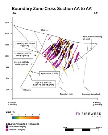 Map 2: Boundary Zone composite intervals in 2025 drilling, 2024 drilling and pre-2024 drilling with constrained resource projection to surface (CNW Group/Fireweed Metals Corp.)