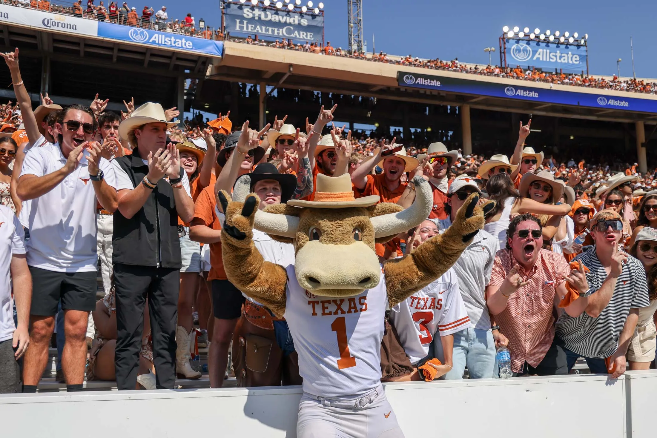 Hook 'Em the mascot celebrates with fans before a football game between the Texas Longhorns and the Oklahoma Sooners on Oct. 12, 2024 in Dallas.Photographer: David Buono/Icon Sportswire/Getty Images
