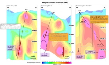 Drill holes SAC-11 (see press release dated May 5, 2025),  SAC-15 and SAC-18 have tested approximately 450 metres of  north-to-south strike length with the system remaining open in all  directions. Due to rig limitations, holes SAC-15, SAC-18 and SAC-20  (assay results pending) were stopped prematurely while still in strong  mineralization. A higher capacity rig is now drilling hole SAC-21 and is  progressing at a significantly improved rate.Magnetic Vector Inversion ("MVI") modelling of airborne  geophysical data is proving to be quite useful at identifying Phase 2  and Phase 3 porphyry mineralization (see Figure 2) and as a result drill  hole SAC-21 is currently being directed into an MVI high.