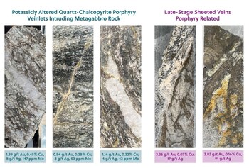 Relogging of previous drilling and interpretation of these new  results and more extensive surface mapping in the San Antonio Project  have resulted in the identification of three mineralized phases which  outline a very large porphyry footprint and are summarized below:    Phase 1 is a large, three kilometre x three-kilometre area  displaying a phyllic altered, porphyry halo zone, which hosts low grade  gold (0.2 g/t Au-0.5 g/t Au), extends from surface to a minimum of 700  metres depth and is open in all directions. At surface it envelops and  includes the Pound, COP, COP West, Euro and Euro West targets. The  Company plans to drill test all of these targets in 2025.Phase 2 is a late-stage, gold and silver rich sheeted veinlet  system (CBM Veins) beginning at surface but with more robust grades from  300 metres below surface.Phase 3 is a gold-copper-silver-molybdenum porphyry system  with potassic alteration (secondary biotite). This system commences at  approximately 400 metres below surface and displays an unusually high  gold to copper ratio of up to 4:1 in grade. Phase 2 mineralization locates close to or in contact with the  Phase 3 porphyry system. Both Phase 2 and Phase 3 mineralized zones are  found within the large Phase 1 mineralized porphyry halo. Examples of  Phase 2 and Phase 3 mineralization are provided in assay Table 2 and  Table 3.