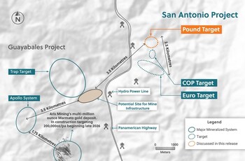 Ari Sussman, Executive  Chairman commented: "Having just walked the entire San Antonio Project  with the team, I am extremely impressed by the sheer scale of the system  and its exciting potential. Although exploration is in its infancy, we  are confident that aggressive drilling will prove fruitful as we advance  our understanding of the system. It is important to note that the  porphyry system discovered at the Pound target is approximately equal  distance (3.5 kilometres) to the proposed infrastructure location for a  future mine from our Apollo system at  the neighbouring Guayabales Project. Equally important factors about the  San Antonio Project are that the hydro-power lines run right across the  project, the porphyry discovery at Pound is located less than a  kilometre from the Pan American highway and there are no communities  living on or near the area."