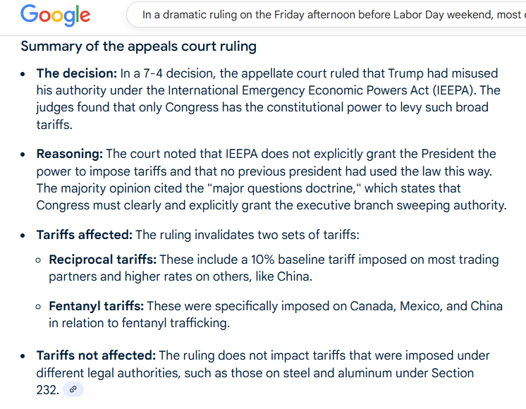 Gemini AI Overview: On August 29, 2025, a federal appeals court ruled that most of former President Donald Trump's global tariffs were illegally imposed, but the tariffs will remain in place pending a likely appeal to the Supreme Court. The decision by the U.S. Court of Appeals for the Federal Circuit affirmed a lower court's finding that Trump exceeded his authority by using an emergency powers law to enact the tariffs.