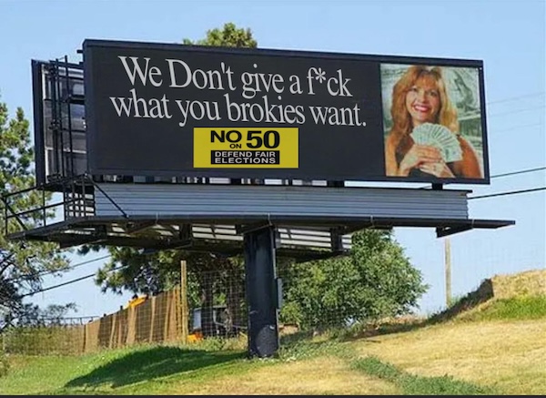 Check this out, Wharfie. Billboard seen in Southern California against gerrymandering ...