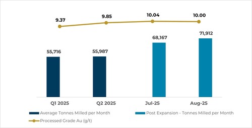 - Milling rates increased sharply in July and August, averaging 2,415 tpd, compared to 1,971 tpd over the six months ended June 30, 2025. In August, throughput also reached approximately 3,000 tpd on several days, demonstrating strong operating performance at design capacity.