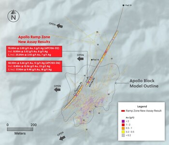 - APC106-D2, which is the deepest hole drilled to date into the Ramp Zone, cut 70 metres at 2.00 g/t gold and 5 g/t silver.
