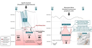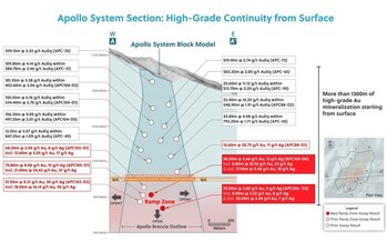 - The Ramp Zone mineralization continues to be overprinted in places by the same late-stage high-grade porphyry veins ("CBM veins") that overprint the balance of the Apollo system drilled to date from surface.