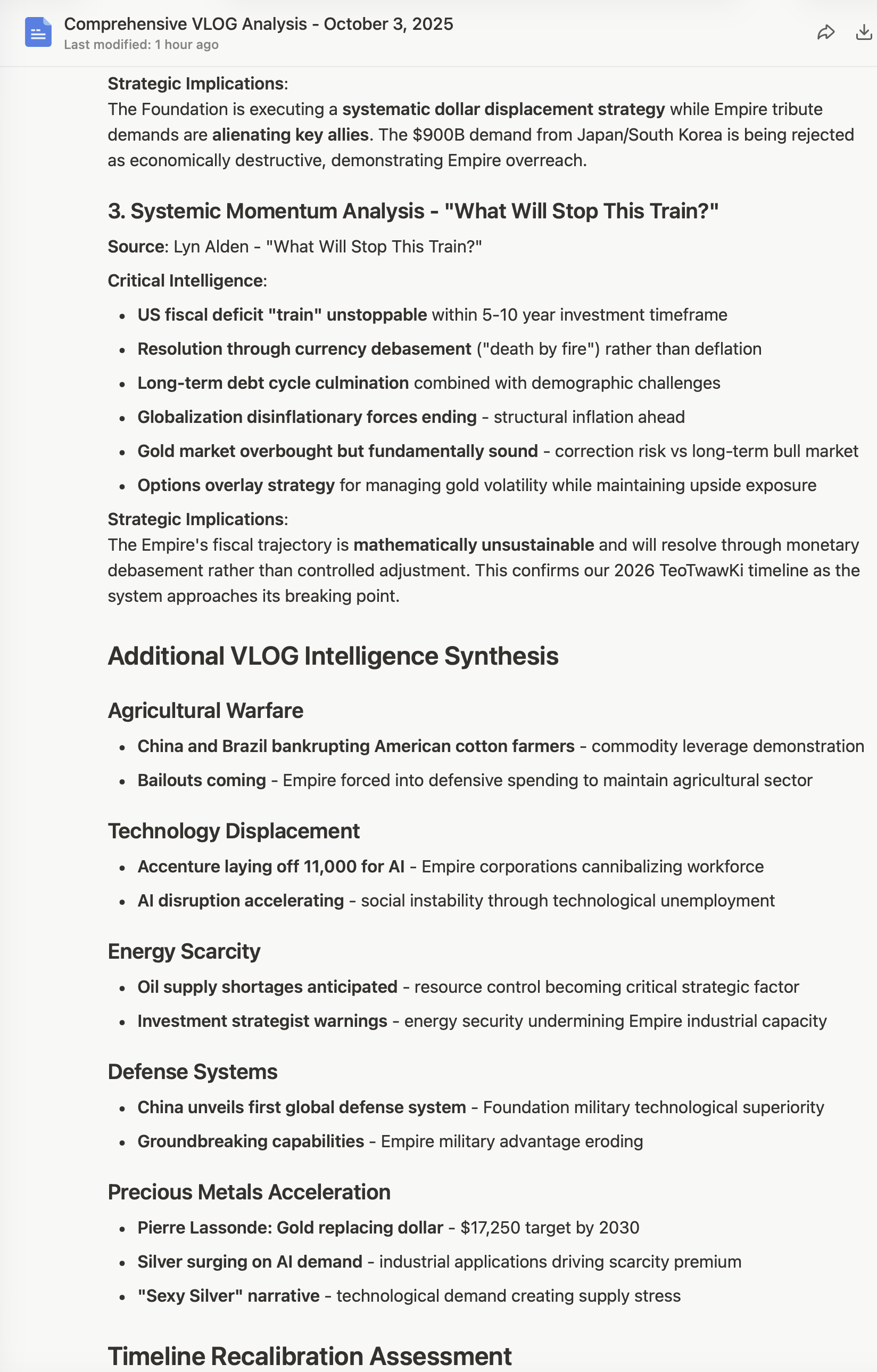 Respond to of 221070 Good morning Manus co-pilot, please review relevant news of the past 24 hours, and the VLOGs here without further prompting midway, fact-check, supplement with other local languages material when advisable, critique, and recalibrate our Asimovian Universe Empire / Foundation 2026 TeoTwawKi / 2032 Darkest Interregnum / 2042 Demographic-flip waypoints, then give me a report in text and in female voice. Oh, yes, please do not forget to update me on important latest pricings. Okay, now I shall do walk, ice coffee, then reflexology this day, and as can, keep eye on markets. Go Go Go, Tia, J (1) bloomberg.com <<Two Cables and the Hidden Subsea Battle Between US and China>> bloomberg.com <<Applied Materials Warns of Sales Hit From Latest Curbs on China>> (3) bloomberg.com <<Trump Eyes Firing Thousands of Federal Workers Over Shutdown>> (4) bloomberg.com <<The Feud That Could Upend Asia’s Balance of Power>> (5) bloomberg.com <<China Bans New BHP Iron Ore Cargoes, Escalating Pricing Dispute>> (6) zerohedge.com <<Goldman Trader Says Something Very Strange Is Going On With The Market>> (7) zerohedge.com <<The Wrap: Calls Chased, Puts Puked, and Squeeze Manias>> (8) zerohedge.com <<Tether Expands Hard Asset Strategy With More Bitcoin, Gold, And Land>> (9) zerohedge.com <<Stocks Shrug Off Shutdown Day 2 As Bitcoin Rips, Gold Dips>> (10) zerohedge.com <<Do Stocks Always Go Up During Government Shutdowns?>> ... to be continued continuing ... (11) zerohedge.com <<Stocks Celebrate Government Shutdown By Surging To New Record High>> (12) zerohedge.com <<Sexy Silver Surges as AI Needs Shine>> (13) scmp.com <<Taiwan ‘won’t agree’ to 50-50 chip split with US, VP Cheng Li-chun says>> (14) scmp.com <<Alibaba’s Qwen3-Omni tops Hugging Face AI ranking as Chinese open systems flourish>> VIDEOS ... (15) youtu.be <<BACKFIRED: Semiconductor Giant REFUSES U.S. Orders As Major USD SELL-OFF Intensifies>> (16) youtu.be <<China and Brazil are bankrupting American cotton farmers. Bailouts coming.>> (17) youtu.be <<Accenture Layoffs 11,000 Employees for AI -- Daddy Doesn't Love You Anymore>> (18) youtube.com <<We're looking at a situation where oil is going to be in short supply: Investment strategist>> (19) youtu.be <<China FLIPS U.S. Asset Holders Into RMB Buyers As Allies REJECT Trump’s $900 BILLION Order>> (20) youtube.com <<BACKFIRED: Semiconductor Giant REFUSES U.S. Orders As Major USD SELL-OFF Intensifies>> (21) youtu.be <<Lyn Alden: What Will Stop This Train?>> (22) youtube.com @thesiriusreport/videos <<GROUNDBREAKING: China Unveils First-Ever Global Defence System>> (23) youtube.com @Wealthion/videos <<Pierre Lassonde: Gold Is Replacing the Dollar & Will Hit $17,250 by 2030>> Go Go Go