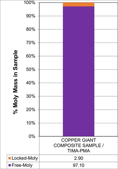 - Grind sizes were relatively coarse with a P80 150–180µm in TIMA analysis. Molybdenum mineralogical analysis shows 97% of molybdenite reported as free grains at P80 150–180µm in TIMA-X (TESCAN Integrated Mineral Analyzer) analysis.