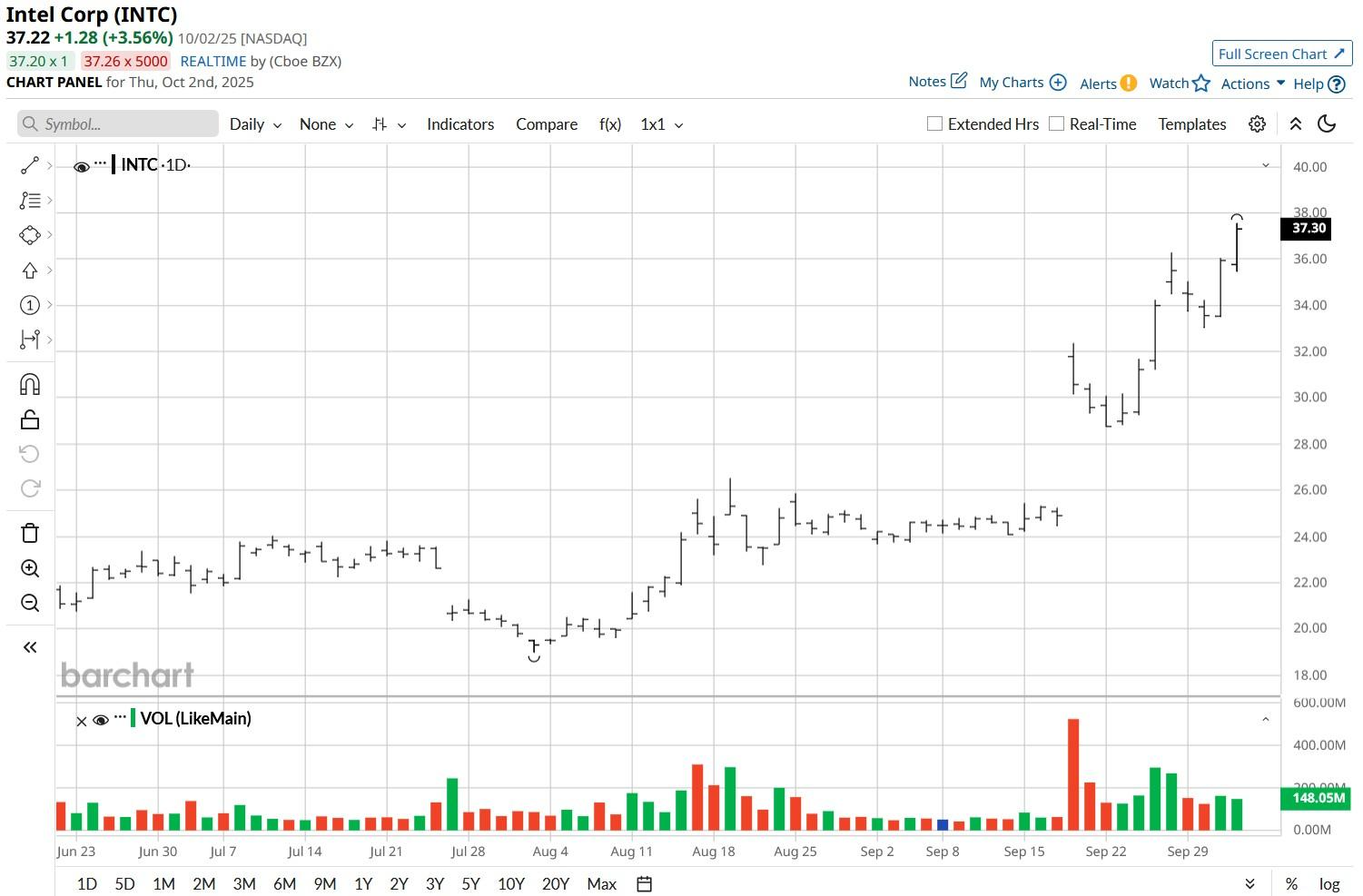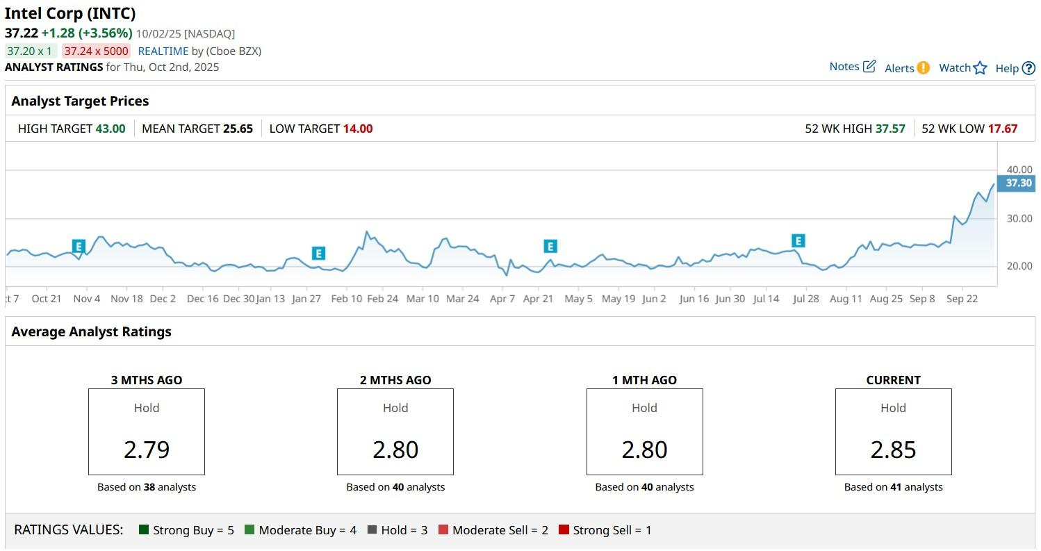 Read Replies (1) | Respond to of 69236 Intel Stock Has Doubled Since April 8. Here Is Where the Stock Could Be at the End of 2025 Wajeeh Khan - Barchart - 1 hour ago Share Intel Corp_ Santa Clara campus-by jejim via Shutterstock Intel (INTC) shares have doubled over the past six months as the struggling chipmaker received capital infusions from the government and major corporations. In August, President Donald Trump’s administration invested some $9 billion to build a 10% stake in the legacy technology company, followed by another $5 billion it received from Nvidia (NVDA) last month. Note that Softbank (SFTBY) parked $2 billion in Intel stock this year as well. INTC is now trading at a price last seen in April 2024. www.barchart.com Why Did INTC Stock Push Higher on Thursday? INTC stock continued to extend gains on Thursday following reports that Advanced Micro Devices (AMD) is in early talks to become its foundry customer. Investors cheered Intel shares today mostly because such a development would validate the firm’s push to compete with Taiwan Semi (TSM) and Samsung in contract manufacturing, a key part of its turnaround strategy. Winning a direct rival as a client would signal confidence in Intel’s process technology, potentially attracting other fabless customers. Plus, it may help offset the capital intensity of building domestic fabs, improving utilization and margins. Strategically, it aligns with the broader U.S. efforts to localize chip production and could, therefore, attract further government support in the coming years. All in all, this would mark a shift from the INTC’s insular model to a more diversified revenue stream, boosting long-term visibility and shareholder confidence that may lift Intel share price over time. Where Options Data Suggests INTC Shares Are Headed Options data from Barchart paints a cautious picture for INTC shares at least through the end of 2025. Contracts expiring on Dec. 19 suggest a trading range of roughly $30 to $44.50, indicating nearly 20% downside potential in the worst-case scenario. In the near term, through the end of next week, traders are pricing in a possible retreat to about $34.68. Given the uncertainty surrounding the future of INTC and the potential profit-taking after a huge run-up, the downside case looks far more likely to play out in Intel stock. Note that Bernstein analyst Stacy Rasgon is even skeptical of the AMD news, noting Intel’s most advanced nodes (like 18A) are still in development and that the chipmaker may prefer TSMC’s Arizona facility for U.S- based production. Wall Street Remains Bearish on Intel Despite positive developments, Wall Street remains largely bearish on Intel shares for the next 12 months. The consensus rating on INTC stock currently sits at “Hold” only with the mean target of $25.65 indicating potential downside of more than 30% from here. www.barchart.com This article was created with the support of automated content tools from our partners at Sigma.AI. Together, our financial data and AI solutions help us to deliver more informed market headline analysis to readers faster than ever. On the date of publication, Wajeeh Khan did not have (either directly or indirectly) positions in any of the securities mentioned in this article. All information and data in this article is solely for informational purposes. For more information please view the Barchart Disclosure Policy here . More News from Barchart