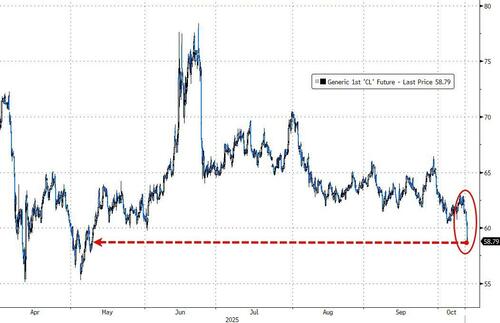Crude prices double-plunged today (crashing over 4%) on the back of Israel-Gaza peace deal and the China tariffs talk as fears of a supply surplus remain over-arching, banging WTI back below $60 for the first time since early May...