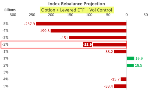 And on the macro-side, as we noted yesterday, Nomura's Charlie McElligott warned, IF the “AI Singularity” goes wrong…or any number of potential “Vol Catalysts” for that matter (anything that could drive an old-school “Correlation 1 / Risk-Off” –move)… there’s just so much mechanical deleveraging and exposure reduction sitting out there btwn Options and Leveraged ETFs, which you can see below in the asymmetric skew of “$notional to SELL” in a drawdown, versus that of the “$notional to BUY” on further Spot rally...