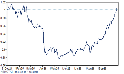On the other side of the debasement trade, precious metals are benefiting from their traditional haven status and cryptocurrencies are rallying again, this time due to their purported function as a refuge from the impacts of government policy. Gold is up over 50% this year and recently surpassed a record $4,000 per ounce, while silver surged to an all-time high.