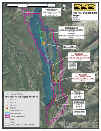 A five-year Multi-year Area Based Exploration Permit ("MYAB Permit") was recently approved on the Duncan Lake Project by the British Columbia Ministry of Mining and Critical Minerals ( Figure 2). The MYAB Permit allows for up to 21 drill sites north of the historic Duncan Mine, which was developed by Cominco 1957-1960. Cominco identified eight mineralized zones but never produced ore from the mine. Between 1989 and 1997, Cominco and Teck Resources completed 12 diamond drillholes approximately 2,000 metres north of the Duncan Mine which intersected strong lead-zinc mineralization in the east limb of the north plunging Duncan Anticline. Rokmaster completed a small drill program in 2022 by re-entering one of these historic drillholes, which are all now on Rokmaster claims, and successfully intersected the west limb of the Duncan Anticline and cored a wide interval of Zn-Pb-Ag mineralization in the east limb (see news release dated May 17, 2022).