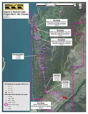Field work on the Duncan Lake Project in 2025 included trenching at the No.3 Zone and further prospecting and sampling in the Mag Zone ( Figure 3). This work followed 2023 sampling which collected 127 soil samples and 22 rock samples1. Three of the trenches completed at the No.3 Zone returned high lead and zinc results with appreciable silver grades over meter-scale widths with channel sampling. An outcrop exposure at the No.1 Zone, approximately 3.1 km south of the No.3 Zone, was also channel sampled returning 14.64% combined lead and zinc with 6.67 g/t Ag over 4.5 m (Table 1). More advanced geochemical analysis is ongoing to assess the germanium, gallium, and indium concentrations in the mineralization.
