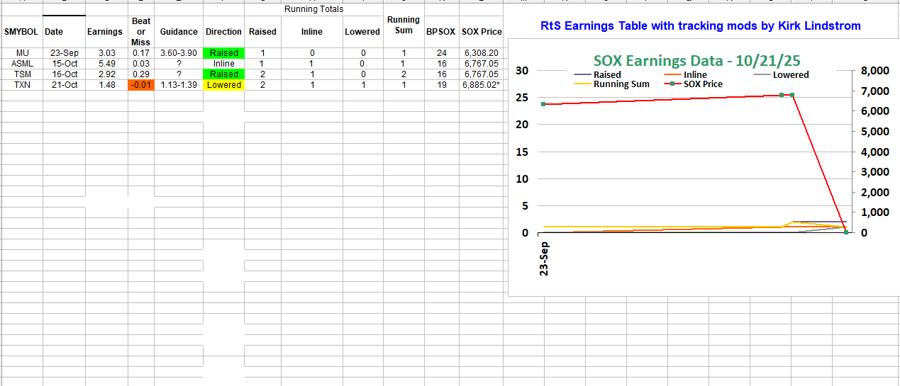 SOX Components Earnings' Table Update - Now Including TXN's Miss and Lowered Guidance resulting in an 8% Drop in TXN's Share Price. TXN has been struggling for a while to build enough momentum to begin both regular beats and raises in guidance: