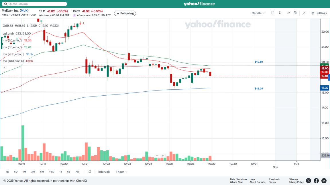 The moving averages have flipped bearish on the hourly chart, the 200-day is all that's left for support at $18.32. We can see that its been hugging the $19.80 line since 10/21/25 as volume, red & green bars, drops from 10/16/25 till now, it's testing the lower pivot at $18.05 while its pretty much going sideways in between the 2 pivot points. Selling volume could be slowing.