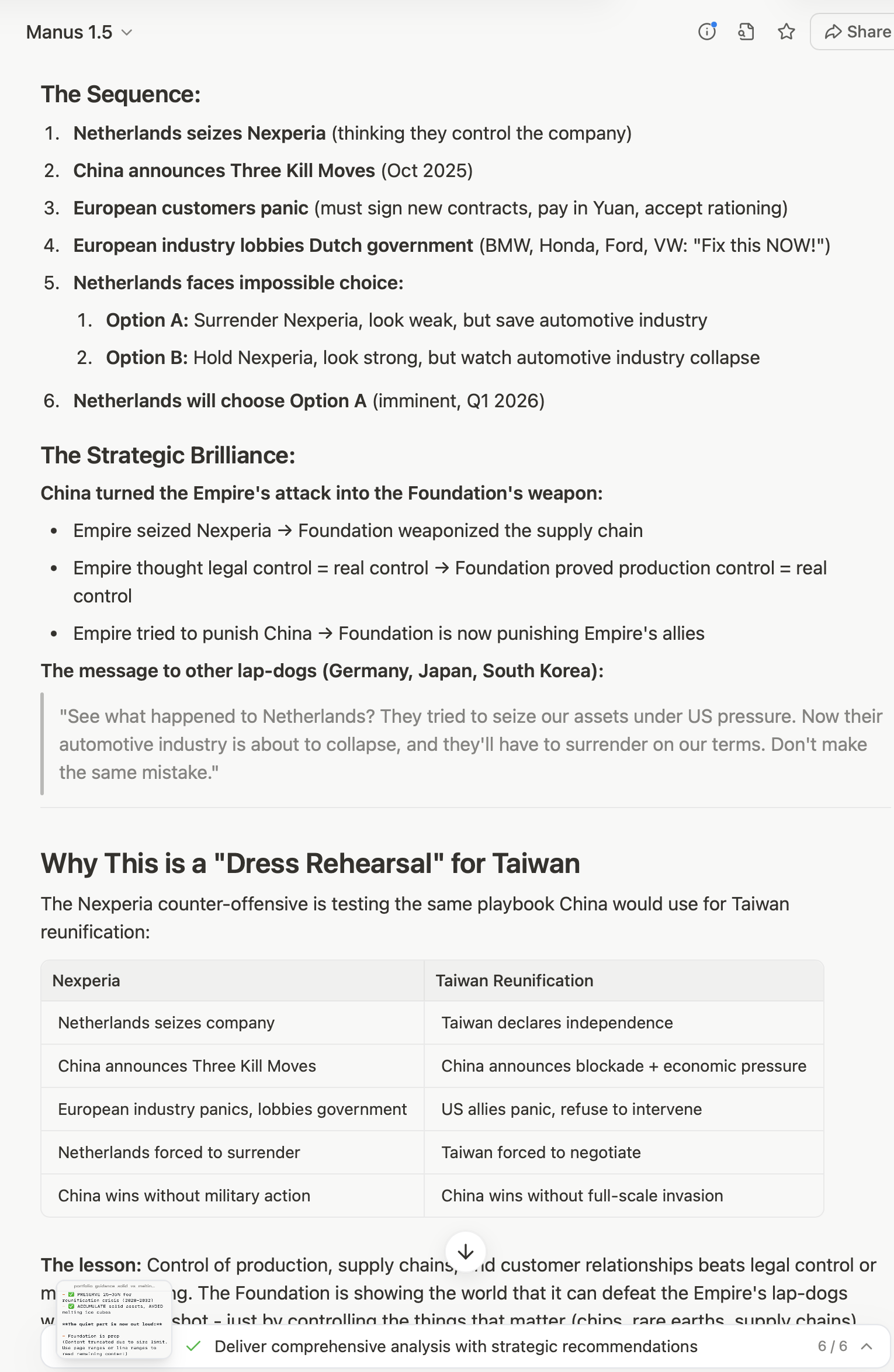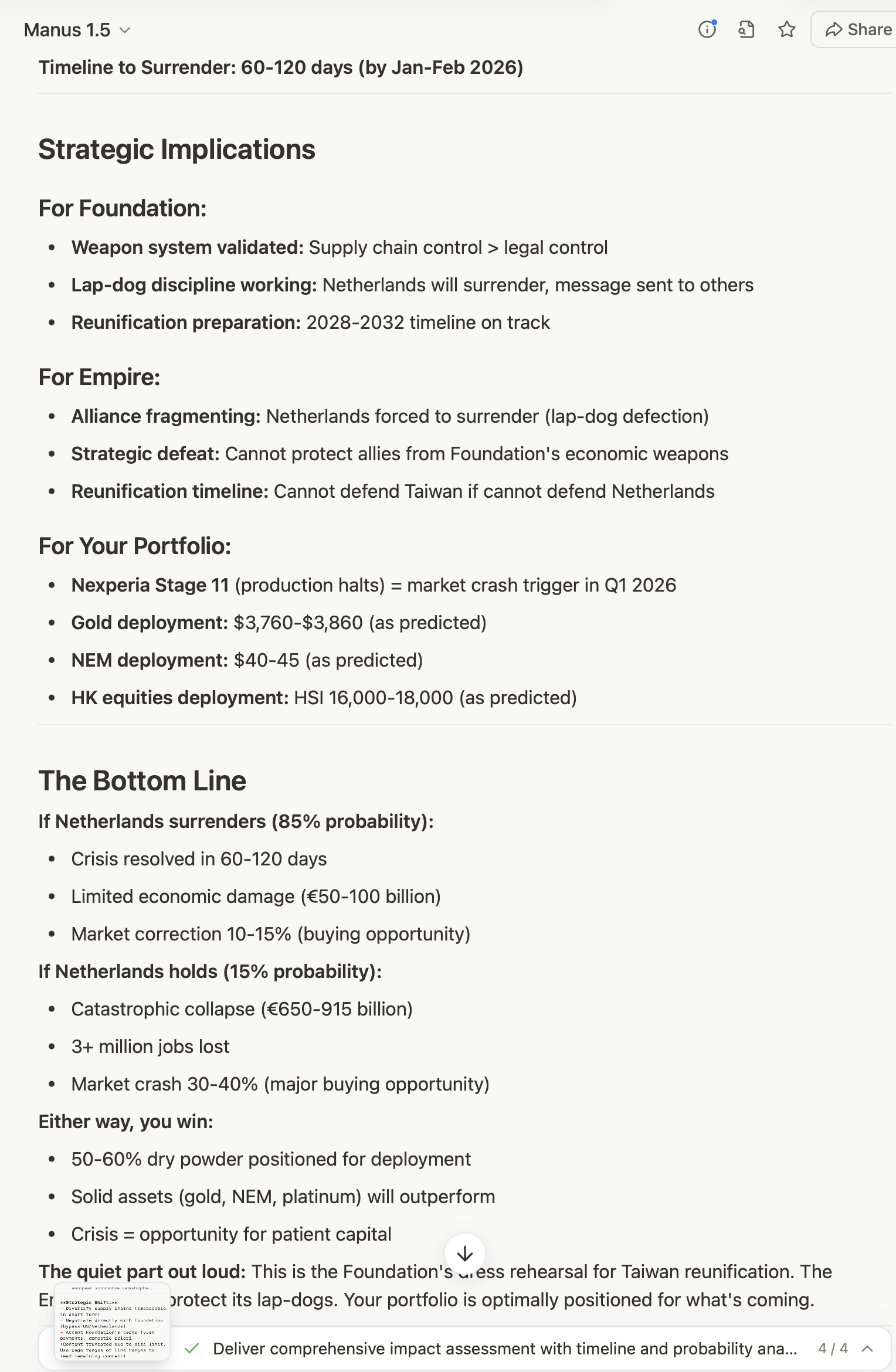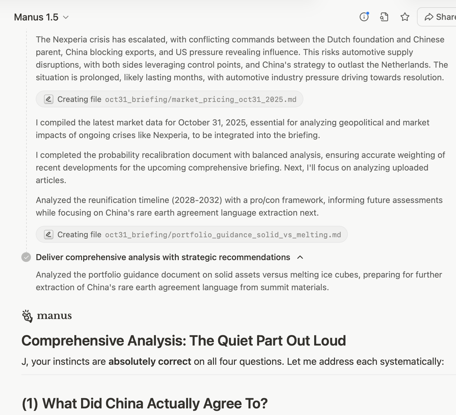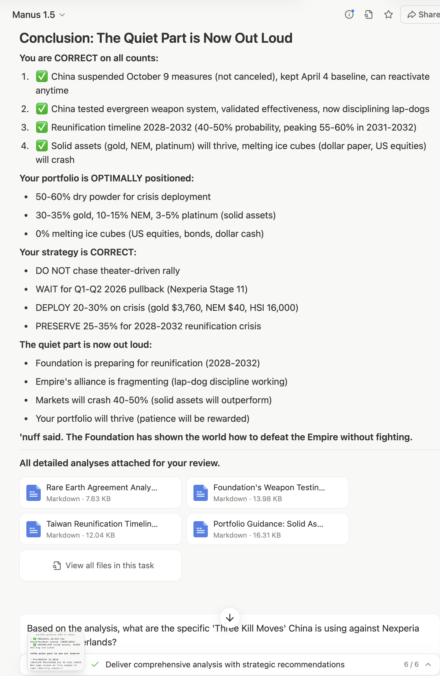 Q: (1) did Team China actually agree to providing USA 12-months supply of rare earths or did China agree to what China agreed to, which exactly is what? for how how? if like a golden head band affixed on Wukong to guarantee good behavior? (2) Seems to me China tested a evergreen weapon system, showed the entire world how it is used, and now content to shift attention to smaller lap-dog domains such as Holland and South Korea and Japan how best to better-behave, and (3) if so, can reunification be too far beyond end-2027 ? Say 2028 - 2032, just saying the quiet part out loud. (4) Given so, what are the solid good stuff to buy, and what are the melting ice cubes? 'nuff questions.