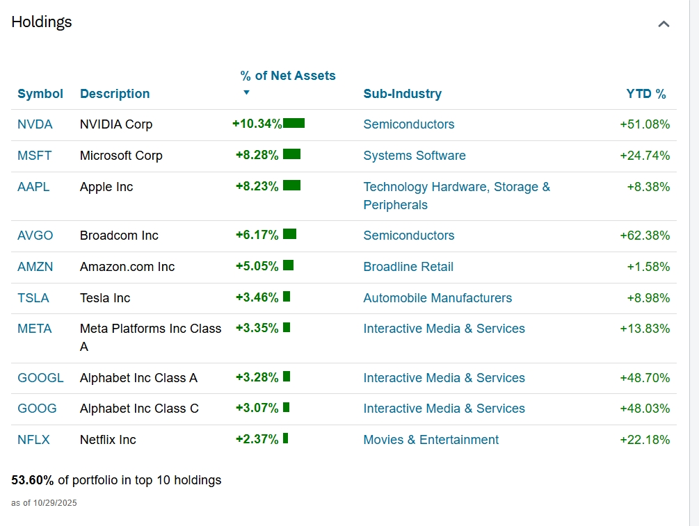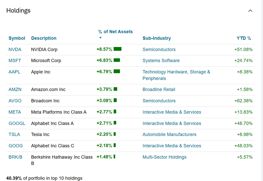 I would hazard a bet that I hold a larger percentage of these type stocks than the average DGI investor. Most of my funds are just holding SPY and QQQ. Below are the top holdings of SPY and QQQ respectively. I also have growth ETFs such as SPMO, SCHG, GRNY, IYW that hold substantial amounts.