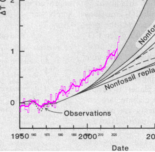 To: i-node who wrote (354046 ) 11/5/2025 2:13:01 PM From: Wharf Rat Read Replies (1) | Respond to of 355466 RealClimate: Model-Observation Comparisons Since we have been periodically posting updates since 2009 of climate model output comparisons to observations across a range of variables, we have now set up this page as a permanent placeholder for the most up-to-date comparisons. We include surface temperature projections from 1981, 1988, CMIP3, CMIP5, and CMIP6*, and MSU/AMSU satellite products from CMIP5 and CMIP6, SST and SSU from CMIP6, and we will update this on an annual basis, or as new observational products become available. For each comparison, we note the last update date, and where the comparison was first discussed. This is a collation of opportunity. To be included, there needs to be a pre-existing public archive of the processed model output for the historical period and projections, and at least one regularly-updated observational data source. Lots of these archives have been produced, but they are not easily discoverable, if available publically at all. Please let us know of others that could be included as well by leaving a comment on the latest open thread . You can use these figures anywhere (with a citation and link back to RealClimate). *Note that Hausfather et al. (2020) made a more complete assessment of surface temperature projections from models from 1970 through to CMIP3 ( discussed here ). Global mean surface temperature anomaliesHansen et al (1981) Original discussion (figure originally courtesy of Geert Jan van Oldenborgh, Hansen et al. (1981) ). Observations are the GISTEMP LOTI annual figures and 5 year mean. Last updated: 23 Jan 2025. Hansen et al (1988) Original discussion (2007) , Last discussion (2018) . Scenarios from Hansen et al. (1988) . Observations are the GISTEMP LOTI annual figures. Trends from 1984: GISTEMP: 0.22ºC/dec, Scenarios A, B, C: 0.35, 0.29, 0.15ºC/dec respectively (all 95% CI ~±0.02 or 0.03). Last updated: 23 Jan 2025. CMIP3 (circa 2004) Last discussion (2015) . Model spread is the 95% envelope of global mean surface temperature anomalies from all individual CMIP3 simulations (using the SRES A1B projection post-2000). Observations (GISTEMP) are the standard quasi-global estimates of anomalies with no adjustment for spatial coverage or the use of SST instead of SAT over the open ocean. Last updated: 23 Jan 2025. CMIP5 (circa 2011) continues