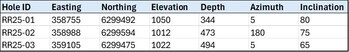 - Hole 3 returned the strongest porphyry indicators with elevated molybdenum assays and identification of potassic feldspar alteration associated to sericite veining.