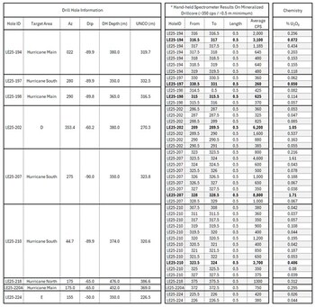 Significantly elevated uranium geochemistry was returned from winter drill holes LE25-194 and LE25-198, as well as summer drill holes LE25-220A and LE25-231, which were drilled on the Hurricane Main Trend east of the deposit. LE25-203, drilled in the winter north of LE25-194, did not intersect significantly elevated radioactivity.