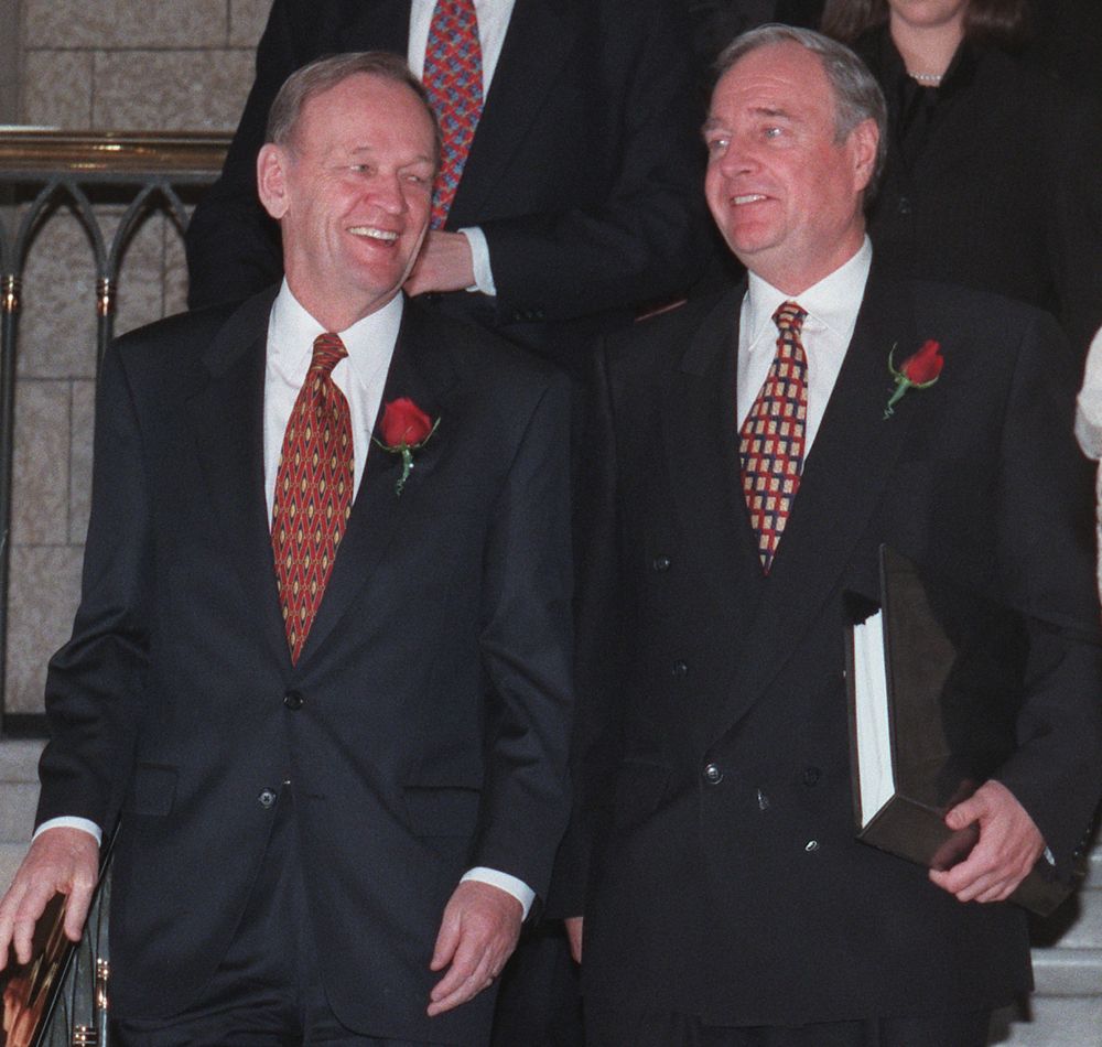 Then prime minister Jean Chretien, left, and finance minister Paul Martin arrive at the House of Commons for the1999 budget speech. Photo by Postmedia News