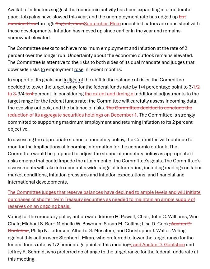 - The Fed said reserve balances have declined to ample levels and will use shorter-term Treasury purchases when needed to maintain sufficient reserves. October's balance-sheet guidance, "the Committee decided to conclude the reduction of its aggregate securities holdings on December 1" is removed; instead, December adds new guidance: “the Committee judges that reserve balances have declined to ample levels and will initiate purchases of shorter-term Treasury securities as needed to maintain an ample supply of reserves."