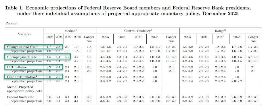 - Economic activity is described as expanding at a moderate pace, with uncertainty around the outlook still high and downside risks to employment having risen recently. The December SEP projects a stronger increase in 2026 GDP compared to the Sept SEP.