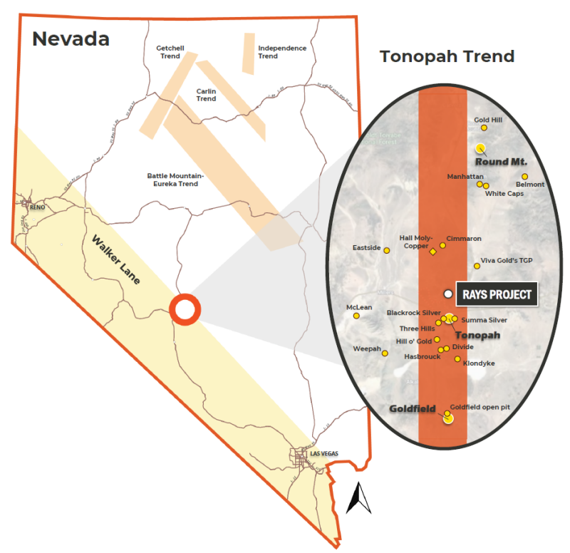 - Rays-West Dome Project: 100% owned gold-silver project covering over 5,000 acres in Nevada’s Tonopah Trend, a historic precious metals district that has produced approximately 175 million oz of silver and 1.86 million oz of gold(2)