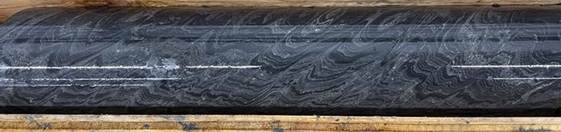 Photo 1: Selected interval of Black Facies mineralization in TS25-003 laminated sphalerite, barite, and mudstone at 1,198 m.
