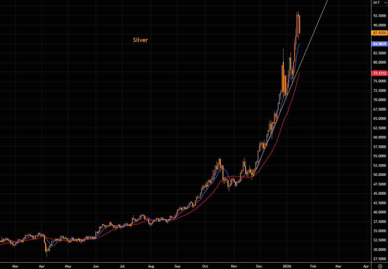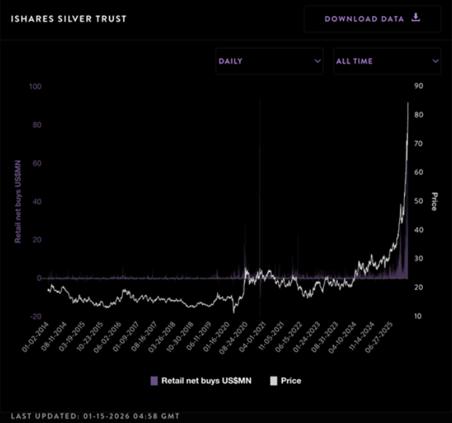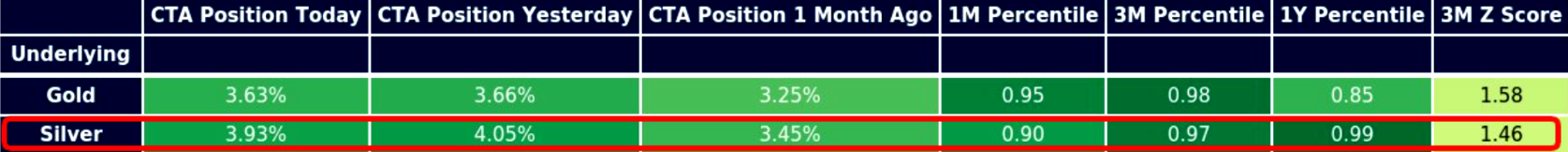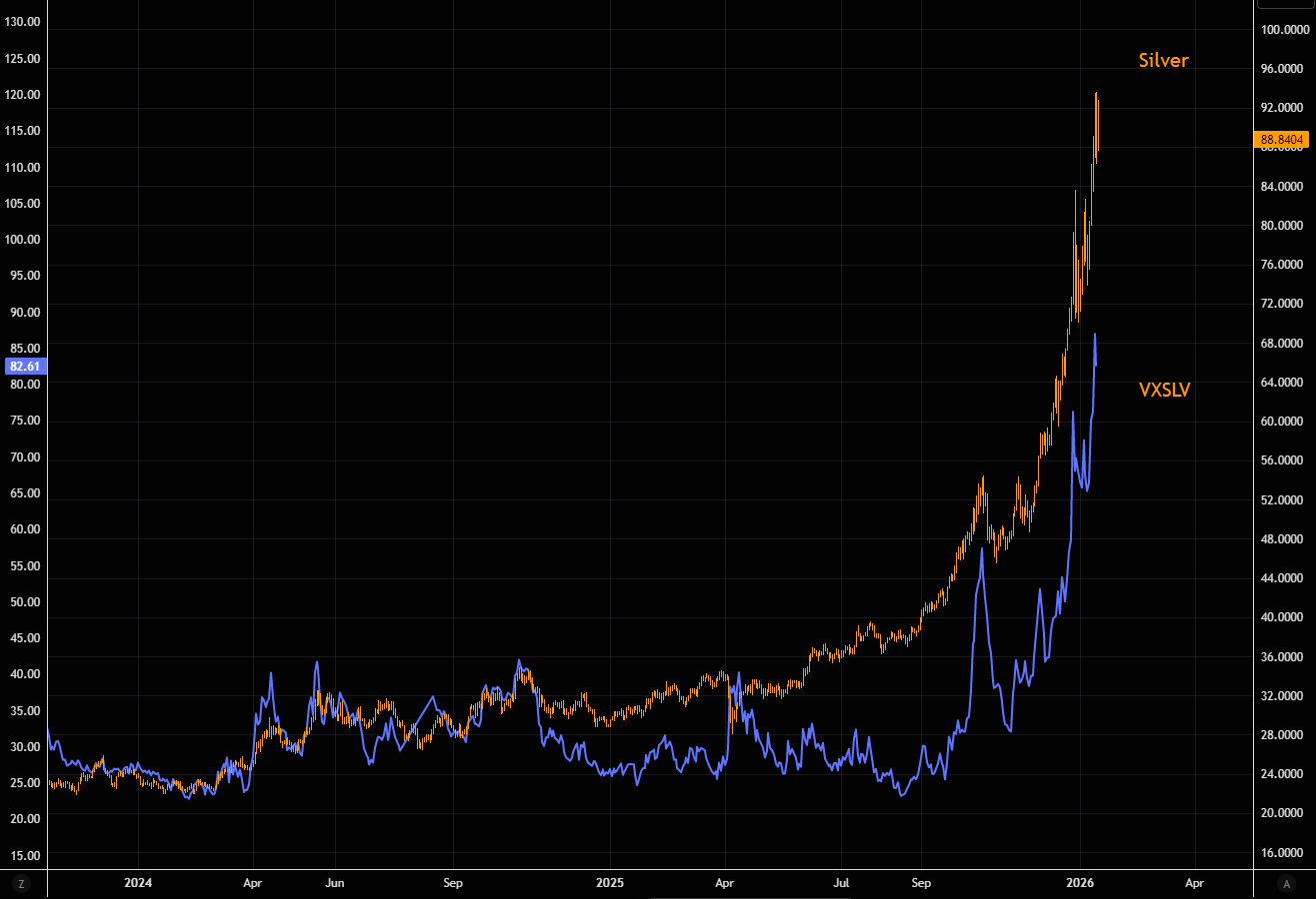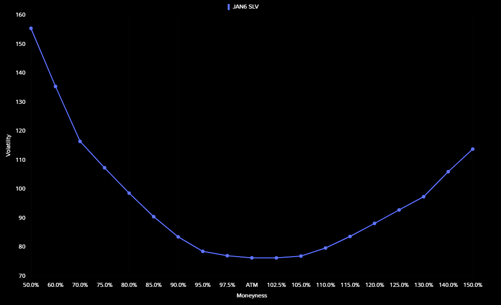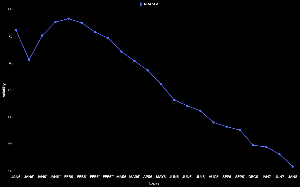 To: bull_dozer who wrote (219407 ) 1/16/2026 8:41:11 PM From: TobagoJack Read Replies (2) | Respond to of 219888 >> THE F*CKING F*CKS ... gift, in the form of chaos, incoming, accompanied by crisis, and volatility, partner / friend respectively, requiring careful-enough navigation along lonely pathszerohedge.com Silver 100%+ Above the 200-Day — Vol Sets the Trap BY THE MARKET EAR FRIDAY, JAN 16, 2026 - 23:45Steep silver Silver just printed its largest down candle since the late-December shakeout. Even so, price is still holding above the 8-day MA (~$85) and well above the 21-day (~$77). Silver could retrace another ~$10 from here and the steep uptrend would remain fully intact. Source: LSEG Workspace Trump and Hassett Rather violent first reaction in silver post the latest Trump/Hassett news (more here ). [url=] [/url] Source: LSEG Workspace Probably better entry points Hartnett points it out: "...silver 104% above 200-day moving average = most overbought since 1980. " Source: BofA Retail's silver love If you still wonder who is driving the silver move... Source: Vanda Pushing momentum CTAs trade (and push) momentum. The latest silver bull has attracted new fresh buying from these strategies. Do not forget, they do not care about emotions, and will reverse the long quickly should things reverse lower. Source: Mentor Q Source: Mentor Q Need silver... . ...to run those AI machines was part of our long silver logic last year. This has gone beyond extreme. Source: LSEG Workspace Expensive theta Silver volatility has exploded and, in our view, is effectively “broken.” Implied volatilities are pricing ~5% daily moves, meaning theta is brutally expensive. Retail punters piling into SLV calls have little grasp of how volatility really works, but they’ll learn fast if silver even nudges lower. A modest pause or reversal would crush volatilities, and options would bleed value rapidly. Volatility compression would hit first, and spot would feel the pressure soon after. Source: LSEG Workspace Extreme Massively inverted SLV term structure with the short end of the curve trading extremely "stressed". Chart 2 shows silver skew. Note just how well bid upside is trading. Source: LSEG Workspace Source: LSEG Workspace