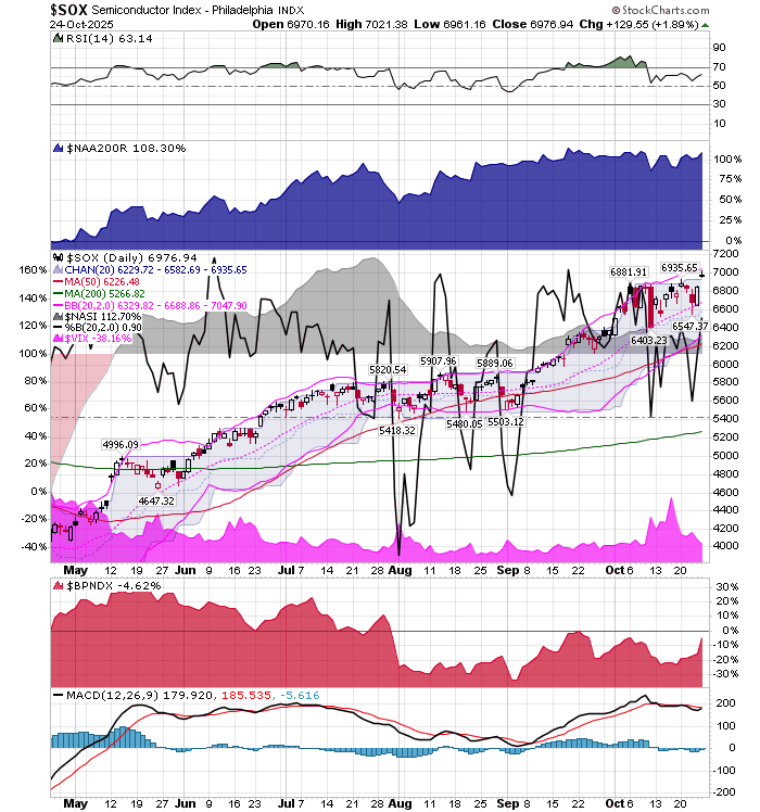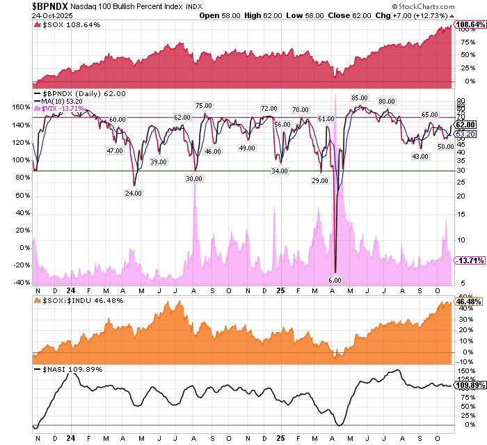I hope that we can discuss all things Semiconductor and Semi-Equipment Related here. Below you will find charts of the SOX/SMH and related stocks: Message 35209919 Earnings' Tables for quarterly reports and guidance for SOX related stocks. Example here: Message 35248462 After the market closes updated data on the NASDAQ 100 and Point and Figure Data for the NDX. Also Point and Figure Data on the 30 SOX Components. An explanation of PnF Charting can be found here: Message 34368823 In a normal Bull Market once the BPNDX exceeds 70% buy signals the NDX is overbought. A fall to below 30% buy signals normally represents a chance to accumulate stocks. Of course new bull markets often lead to more than 70% buy signals. Bear markets can give PnF buy signal numbers in the single digits. April 23, 2024 The market has been over sold. BPNDX reading of 24 and a BPSOX of only 1 has led me to buy the SMH for an oversold bounce. ![]() ![]() I will also post New Highs and New Lows Data for the NDX which includes numerous semiconductor stocks. Finally you will find me sharing all the free data I can from Briefing.com on stocks related to those we discuss here. I hope we will continue to build on the legacy of great former leading contributors here like Don Wennerstrom and Gottfried! | ||||||||||||||