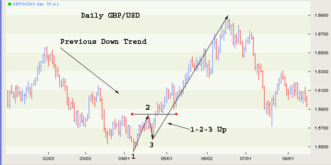 Currently long EUR/USD. Nr1 1.3428 - Nr2 1.3487 - NR3 1.3464 - Entry: 1.35 -------------------------------------------------------------- The 1-2-3 trading system has been around for a long time. Many traders use it in combination with other indicators. It is IMO one of the very best chart set up patterns you will ever see, and once you train your eyes you will see these set ups all over the place. I use this system only on the Forex and after having tried it with so many different combinations of other indicators etc. I've found a way that suits me best so to allow me to continue daytrading stocks for a living. You could say that I play the 1, 2, 3 trading system in the most pure way..nothing else on the chart. The only other ingredient I found that I needed to add was patience.. & & & I only play the daily chart. My buys and sells are a few times a month. Since I don't have any need for bells and whistles I can use any dinky free chart out there. See link at the bottom. I make no claims of any kind. Just thought I share this way of trading since it has given me great satisfaction. & & & Feel free to post your own experiences with the 1, 2, 3 system if you have any. I mostly play EUR/USD pair cause it's the one I know best and has plenty of moves but isn't as volatile as GBP/USD for example. I suggest that if you are new to Forex trading that you make a real effort to educate yourself. The brokers out there try to make it look real easy and cheap to start trading. Don't fall for that. This stuff takes time to learn. And it will take time to learn about yourself how you respond to the many situations that trading currencies throws at you. I suggest you papertrade for at least six months and when you have shown to yourself that you make more than you lose only then consider it with the proper bankroll. See link at bottom. & & & So what is the 1, 2, 3 trading system? You can play the system both long and short and the entry and exit signals are very clear. ![]() This is a typical 1, 2 , 3 set-up going long - You enter the trade somewhere above the nr 2 point and place a stop-loss just below the nr 3 (the stop you move up accordingly to the price). Here is a chart with both short and long patterns. Notice that when you follow the short pattern you enter short when the price drops past the nr 2 point and the stoploss is set just above the nr 3 point: Easy huh! Theory says that the distance between the nr 2 and nr 3 point is the likely length of the move the stock will make. I find this to be the case more so on the smaller time charts (30/15 Min) for day and swing trades. Since I only trade the Day chart the moves are longer and the theory doesn't hold up as often, and mostly in my favour. There is more to learn about this system and I suggest you educate yourself by reading up on the subject. see links at the bottom. Here is a simple EUR/USD Daily chart. See if you can spot the 1, 2, 3 patterns both long and short. Look for when you would enter and exit. ------------------------------------------------------------- 1, 2, 3 pattern education (there are many more places than the few listed here): trade2win.com currency-forextrading.com forex-strategies-revealed.com & & & Free real time charts: dailyfx.com & & & Learn all you can about Forex. Here is a place to start. Go to the school section: babypips.com & & & Another example: ![]() Good luck to you! | ||||||||||||