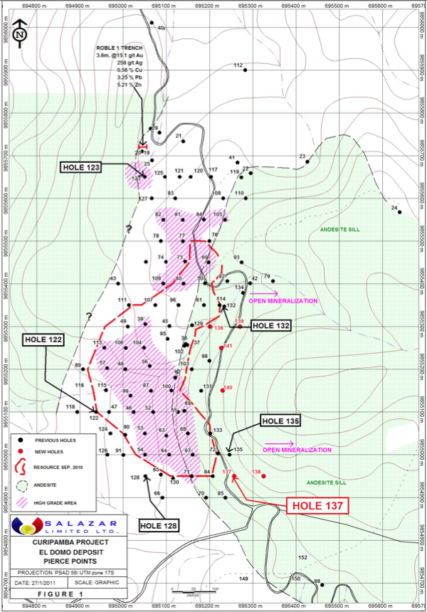 Shares O/S: 46.075MM Warrants: 5.6MM Options: 3.9MM Shares FD: 55.76MM Working capital: ~$4.0MM Resources Salazar Resources web site Fact Sheet Salazar Resources corporate presentation (Feb 2012) Company Profile at 24hGOLD site Mining 101: What is a Massive Sulfide? "Volcanoes of the Deep Sea" movie Charts: Daily - Weekly - Monthly Images Ecuador - exploration projects VMS deposits explained Curipamba Project Hydrothermal Model Sequential Development of the Los Naves Massive Sulphide Curipamba Project map Naves Central sample results Los Naves Phase 2 Drill Program Los Naves Phase 2 Drill Program - close-up Sesmo Sur Phase 2 Drill Program El Domo: Drill Location map - Drill Locations photo - Fault - 3-D View - Cross-section - Drill highlights Santiago: Project Map - Regional Geological Map 12/03/13 SALAZAR PROVIDES UPDATE FROM THE PRESIDENT Vancouver, British Columbia, December 3rd, 2013 - Salazar Resources Ltd. (TSX.V: SRL; FSE: CCG) (the "Company") is pleased to provide the following update from Fredy Salazar, President and CEO: I want to express my many thanks to the Company's shareholders for their invaluable assistance and support to the Company in these complicated times for the mining industry. Without the continued support and loyalty of our shareholders we would not have been able to continue advancing Salazar from an exploration company to a mine development and production company. Salazar has not been immune to the many difficulties which junior resource companies are facing in this current market environment, but fortunately despite these difficult circumstances, the Company has been able to continue working diligently towards achieving its objective of continuing to progress and develop its El Domo project towards a production decision. Earlier this year the Company finalized a strategic investment agreement with Union Mining International BV, (a wholly owned subsidiary of Trafigura Beheer B.V.) to help advance the Curipamba project towards a mine development stage. The agreement, amongst other things, provided for the necessary funding for the completion of a Preliminary Economic Assessment ("PEA") at the El Domo deposit within the Curipamba project. The PEA is nearing completion and is expected to be finalized in January 2014. As part of the completion of the PEA significant work is being completed on several aspects of the El Domo project, including: - An update of the current resource estimate at El Domo incorporating the results of the most recent drilling campaign; - Metallurgical studies to determine the best recovery methods for the existing metals at El Domo; and - Design alternatives for both open pit and underground mining methods. The Company looks forward to presenting the results of the PEA in the coming month to its shareholders. The Government of Ecuador in recent months presented changes to the Mining Law and has introduced a new medium-sized mining category. The government approval process for production capacity up to 1,000 tonnes of ore per day for underground operations, and up to 2,000 tonnes per day for open pit operations, has been significantly simplified, and will be governed by the Mining Law versus having to negotiate taxation and royalty terms with the Government as is the case for larger scale projects. This is of significant importance as these medium sized mining companies will no longer be required to sign a Production Contract with the State, and therefore will not be subject to windfall taxes but rather have a fixed 4 percent royalty rate. The El Domo scale of operations will fall within this range and therefore be classified as a medium sized mining company and significantly benefit from reduced tax rates. At the present time, the Ministry of Nonrenewable Natural Resources is drafting the regulations allowing for an immediate application of these reforms. We are confident the regulations will confirm the rules and provide encouragement for mining development in Ecuador. We await the results of the updated resource estimates and more advanced metallurgical testing and once received, the Company will be providing a further update. ON BEHALF OF THE BOARD OF SALAZAR RESOURCES LIMITED Fredy Salazar, President & CEO Salazar Resources Limited | ||||||||||||||