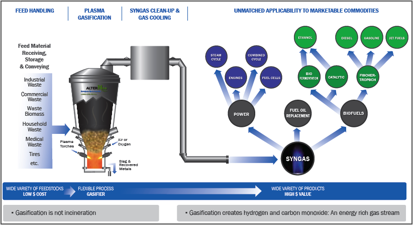 TSE: NRG | OTC: ANRGD ![]() Alter NRG sells plasma gasification solutions that convert waste-to-energy (WTE), generating synthetic fuels from municipal waste, biomass or other feedstocks. Gasification is a process that uses extremely high temperature plasma torches but it is not incineration. The technology was developed over the last few decades by Westinghouse Plasma Corporation. That business unit was spun out and then later acquired in its entirety by Alter NRG. In December 2011 the company announced that it had signed a deal with Air Products for a $22MM gasifier to be located in Tees Valley in the UK. This is the first of five that Air Products intends to build and is representative of the type of larger deal that Alter NRG is currently pursuing. In the Fall of 2013, Air Products announced a final decision to proceed with TV2, a second plant of the same scale to be built adjacent to TV1. Subsequently Air Products has publicly discussed plans for a third plant that will be located in Scotland. In 2014 the company announced the first plant being built by GES in China. This is a new customer in China that is building plants to take in municipal solid waste. Alter had been working with GES to plan six plants but recently learned that they now have plans for a total of fourteen plants. GES has also developed and patented a method for taking the vitrified material that is the product of gasification and spinning it into an officially-approved construction-grade insulation material. The revenues for the plant operators will be substantial and should provide a significant incentive. In January 2014 Alter NRG announced commissioning of an ash vitrification facility for an existing incinerator by GTS in Shanghai. This event is the first sale into a new market for Alter NRG and significantly expands the size of their addressable market. This is the first time that Alter NRG has had a turnkey product in their line. The product is a turnkey bolt-on incinerator turbocharger. Incinerator operators pay high tipping fees to dispose of incinerator ash because it is a toxic hazardous waste. The "turbocharger" turns the ash into an inert vitrified material that can be used as concrete aggregate, for example. So the incinerator operator no longer produces a large amount of hazardous material but instead turns it into a product that can be sold. Also, the turbocharger enables the operator to take in hazardous and medical waste that command high tipping fees (incinerators are not hot enough to handle these) so that further offsets the installation cost. Finally the turbocharger also creates syngas which can be used or sold. In March 2014 Cahill Energy announced that they had signed a $240MM deal to install a gasification facility in Barbados using technology from Alter NRG. The potential for plasma gasification for island nations is significant. Natural gas costs are typically very high as it is all imported and also landfill capacity is becoming a critical problem in places like Puerto Rico. Plasma gasification addresses both of those issues extremely well. In March 2014 the company announced that studies conducted by GE showed that their turbines generate more power when running on syngas than natural gas. There is a fleet of 11,000 GE turbines operating in the field that GE considers targets for syngas replacement. In some cases, GE turbines generated up to 25% more power on syngas than natural gas. GE and Alter are developing joint marketing materials. Highlights