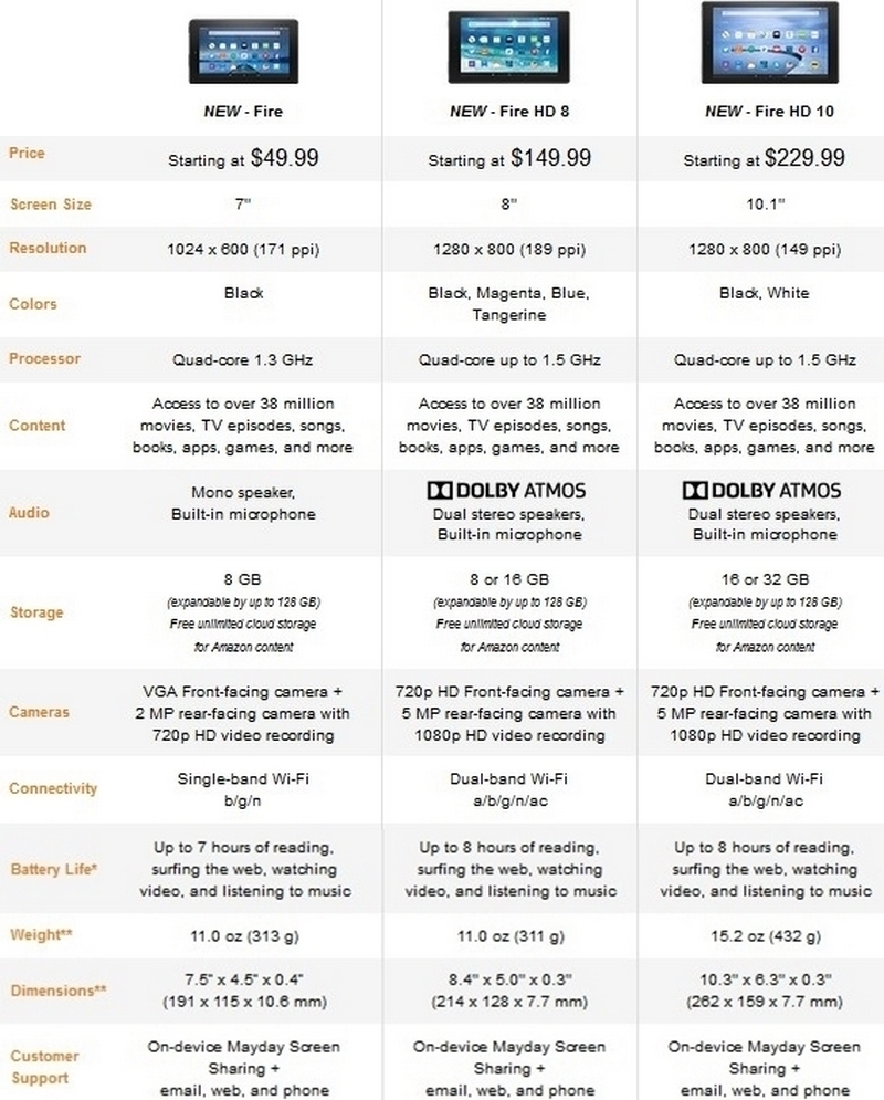 . . . . . . . . . . The Kindle Fire, a tablet version of Amazon.com's Kindle e-book reader built with Quanta Computer,was announced in September 2011, featuring a color 7-inch multi-touch display and running a custom version of Google's Android operating system called Fire OS. The device which included access to the Amazon Appstore, streaming movies TV shows and music, as well as Kindle's e-book,s was released to consumers in November 2011. In September 2012, the Kindle Fire was upgraded to a second generation, its price reduced, RAM upgraded to 1 GB and processor clock speed upgraded to 1.2 GHz. A more powerful and video-friendly version, the Kindle Fire HD (7 and 8.9 inch versions) was also made available. In September 2013 the Kindle Fire HD was upgraded to the third generation, base priced at $139, and the Kindle Fire HDX was introduced. The Kindle Fire HDX had an improved graphics engine, double the memory, and triple the processor speed of the previous model. The 7-inch and 8.99-inch versions were introduced at $229 and $379 respectively. These 3rd generation tablets were powered by Fire OS 3.0 "Mojito." In September 2014, the Kindle Fire HDX 8.9 and the Kindle Fire HDs were upgraded to the fourth generation of Fire tablets and the Fire HD 6, Fire HD 7, and Fire HDX 8.9. The current generation of these devices abandon 'Kindle' branding. Current generation devices are powered by Fire OS 4 “Sangria,” a next generation of software based on Android 4.4 (KitKat). ![]() In September 2015, the 5th generation of Amazon Tablets was introduced with 3 new models: the value priced very basic Fire with 7" screen and a quad-core MediaTek processor; the new Fire HD 8 and Fire HD 10 tablets with 8” or 10.1” widescreen HD displays, quad-core Mediatek processors, stereo speakers with Dolby Audio, front- and rear-facing cameras, and microSD card support providing up to 128GB of expandable storage. The 3 new Fire Tablets are powered by OS 5 'Bellini' which is based on Android's new 5.0 Lollipop OS with integrated Amazon hardware, platform, software, content, and cloud.services ... ![]() The primary focus of this board is the 4th and 5th generations of Amazon Fire multimedia tablets, their OS, Amazon multimedia services and applications for Amazon Fire. Discussion can also include earlier Kindle Fire Tablets and while there is no focus on the current Kindle ebook line discussion of these ebook readers is not off topic. - Eric L. - | ||||||||||||
