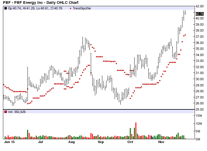 The Chart of the Day belongs to PBF Energy ($PBF). I found the petroleum refining stock by using Barchart to sort today's New High list for the highest number of new highs in the last month then used the Flipchart feature to review the charts. Since the Trend Spotter signaled a buy on 10/1 the stock gained 29.71%. Barchart technical indicators: 100% Barchart technical buy signals Trend Spotter buy signal Above its 20, 50 and 100 day moving averages 16 new highs and up 34.67% in the last month Relative Strength Index 76.01% Barchart computes a technical support level at 38.91 Recently traded at 40.78 with a 50 day moving average of 32.66 Fundamental factors: Market Cap $3.91 billion P/E 8.48 Dividend yield 2.99% Revenue expected to decline 33.30% this year but increase again by 19.70% next year Earnings estimated to decrease 11.50% this year but increase again by 12.00% next year and continue to compound at an annual rate of 7.85% for the next 5 years The Wall Street analysts are all over the map with 5 strong buy, 3 buy, 5 hold, 1 under perform and a sell recommendation.
