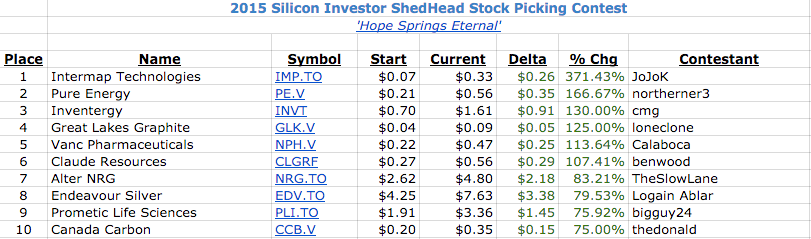 Results from previous SI stock picking contests (2005-09 sponsored by SI member goldsheet): (Click on a column heading to view the spreadsheet for that year.)