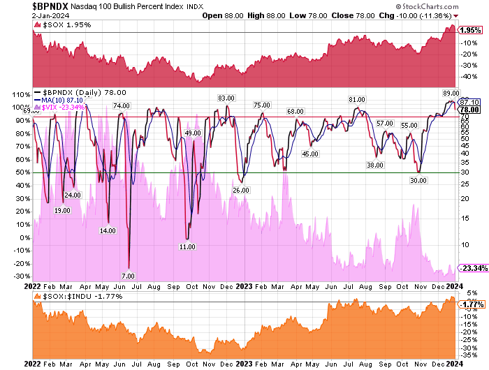 After the market closes updated data on the NASDAQ 100 and Point and Figure Data for the NDX. Also Point and Figure Data on the 30 SOX Components. An explanation of PnF Charting can be found here: