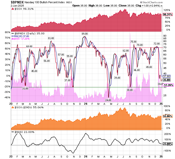 After the market closes updated data on the NASDAQ 100 and Point and Figure Data for the NDX. Also Point and Figure Data on the 30 SOX Components. An explanation of PnF Charting can be found here: