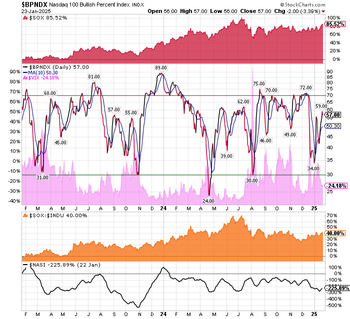 After the market closes updated data on the NASDAQ 100 and Point and Figure Data for the NDX. Also Point and Figure Data on the 30 SOX Components. An explanation of PnF Charting can be found here:
