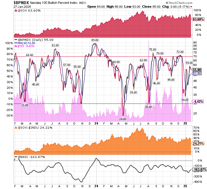 After the market closes updated data on the NASDAQ 100 and Point and Figure Data for the NDX. Also Point and Figure Data on the 30 SOX Components. An explanation of PnF Charting can be found here: